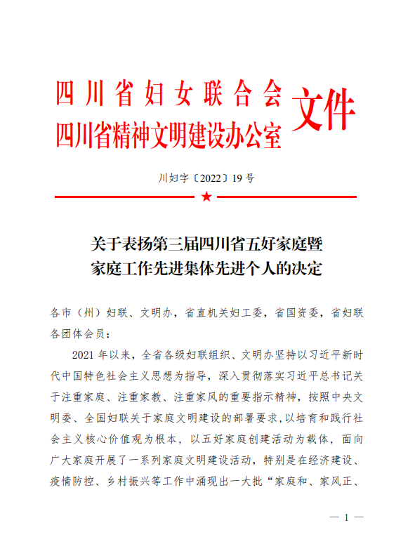 为深入贯彻落实习近平总书记关于注重家庭家教家风建设的重要指示精神,四川省妇联、省文明办以培育和践行社会主义核心价值观为根本,以评选五好家庭、寻找“最美家庭”活动为载体,在“5.15”国际家庭日来临之际,表彰了一批四川省五好家庭、“最美家庭”和家庭工作先进集体、先进个人,太阳集团tcy8722成为荣获“四川省家庭工作先进集体”荣誉称号中唯一的高校参评单位!
