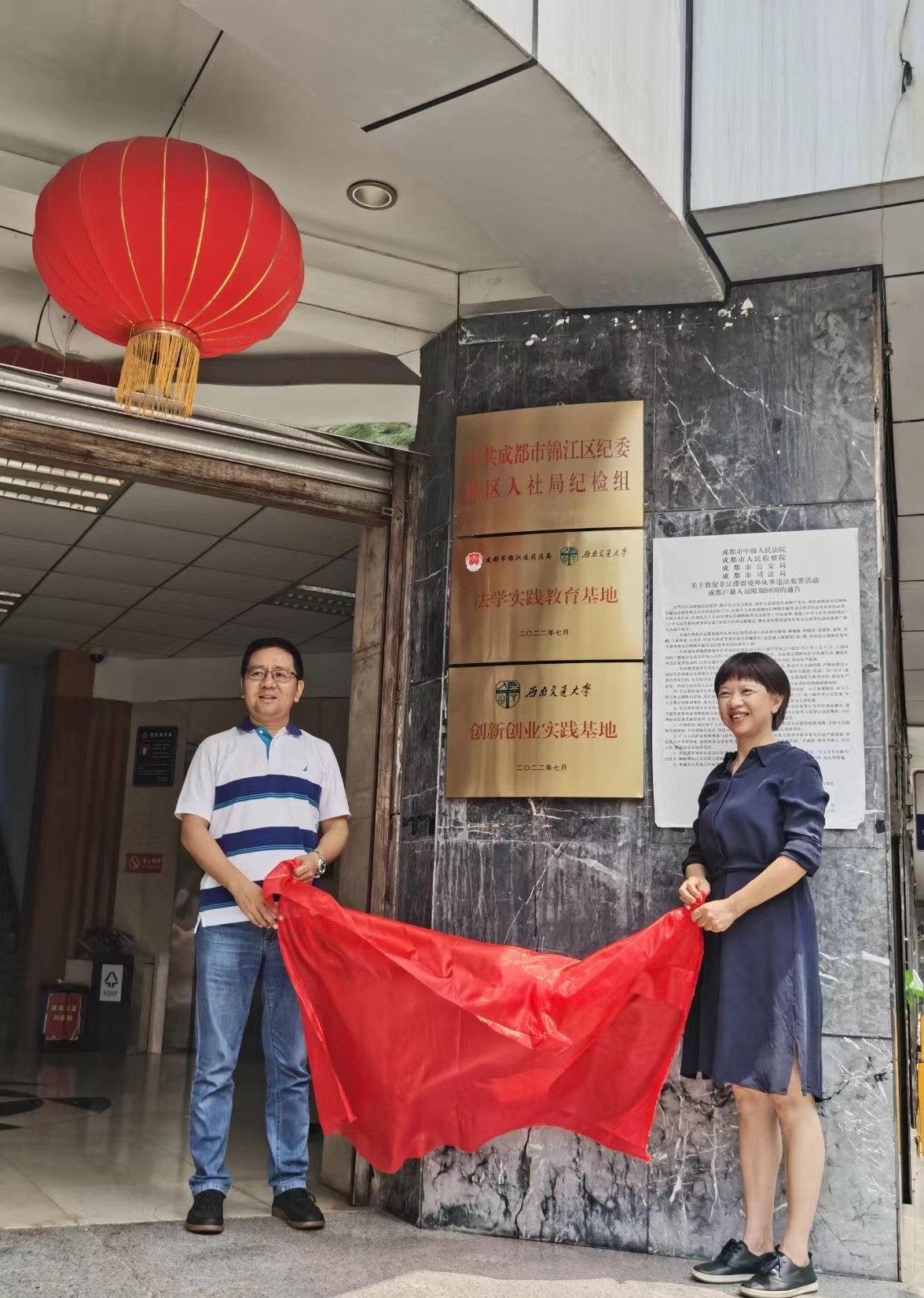 我院党委书记高凡教授与罗伟局长作为双方代表共同为“法学实践教育基地”“创新创业实践基地”合作基地揭牌。最后,我院参会人员还受邀参观了锦江区公共法律服务中心和法律援助中心。