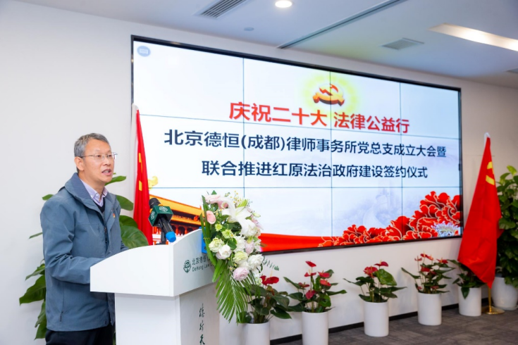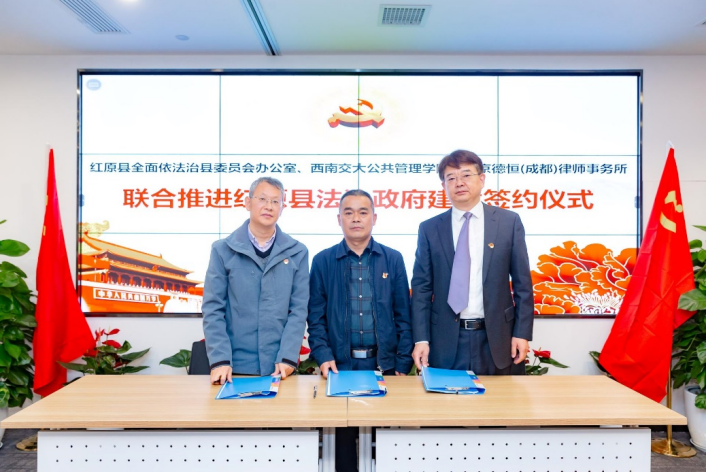 2022年11月3日上午,我院与红原县全面依法治县办、北京德恒(成都)律师事务所联合推进红原县法治政府建设签约仪式在北京德恒(成都)律师事务所隆重举行。我院院长王永杰教授、助理研究员张敖老师出席签约仪式。