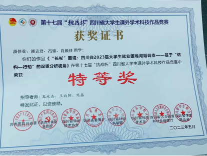 近日,第十七届“挑战杯”四川省大学生课外学术科技作品竞赛在成都大学闭幕。其中,我院推出的作品“四川省2023届大学生就业困难问题调查——基于‘结构—行动’的双重分析视角”项目在本次竞赛中斩获特等奖,“‘物业敲门 村居共治’农集区多元共治模式研究——基于葛仙山镇2年的跟踪调研”项目斩获三等奖。