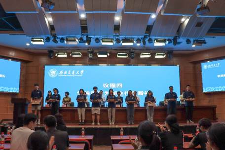 本科生新生周慧和研究生新生王卉代表全体新生上台发言,向师生们分享自己的所感所得。周慧同学表达了自己对交大的热爱和对学院的期盼,抒发出23级新生们的青春豪气与理想追求。她希望大家端正学习态度,养成学习习惯,持续学习过程,历尽千帆、顶峰相见。王卉同学则通过分享自己曾在交大校园里看见过、参与过、感受过的故事与情感,从研究生的视角鼓舞大家保有好奇之秉性与尝试之勇气——既向内反思,做诚实的学问;又向外探索,做有用的人才。