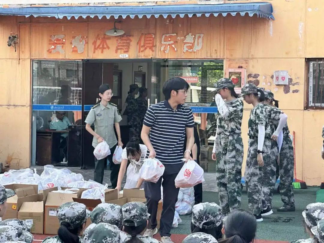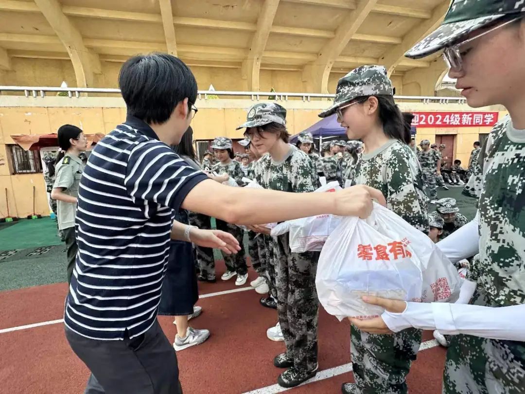 下午16时左右,学院学工组副组长、团委书记莫太林,研究生辅导员许楠、本科2022级辅导员王大海、本科2023级辅导员徐梦莹以及本科新生辅导员肖晨莹一行携着满含学院关怀的慰问物资来到训练场看望2024级的军训新生们。莫太林老师代表学院向参与军训的同学们表示亲切慰问,并给予了热情的鼓励。