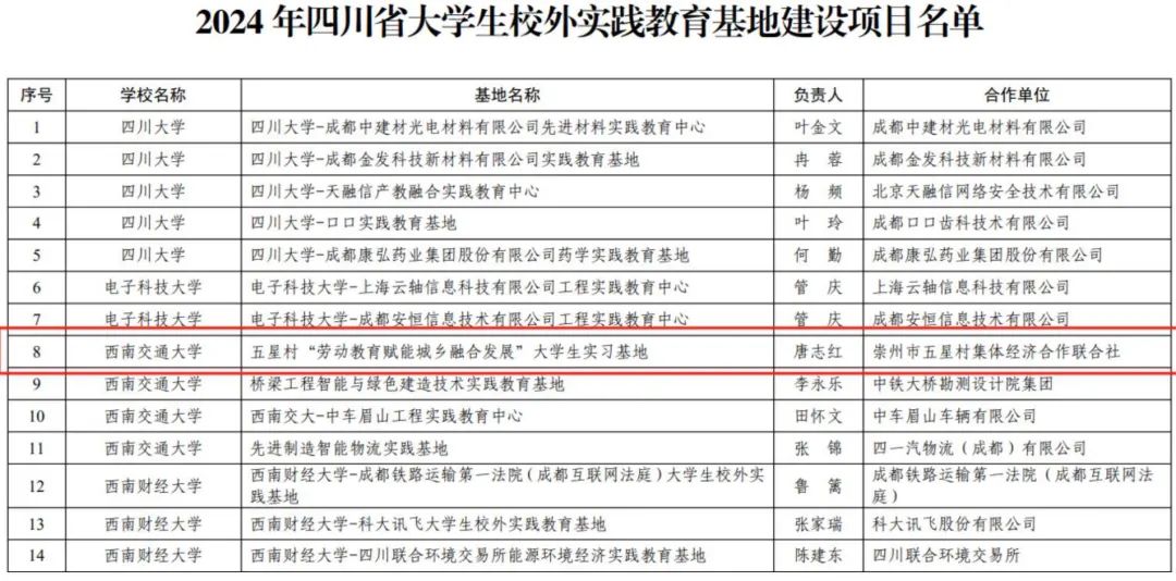 近日,四川省教育厅发布《四川省教育厅关于公布2024年省级大学生校外实践教育基地建设项目名单的通知》,公布了2024年四川省大学生校外实践教育基地建设项目名单,全省共50个基地入选,我院城乡公共治理系(政治学系)系主任唐志红老师负责申报的“五星村‘劳动教育赋能城乡融合发展’大学生实习基地”获批立项建设,是学校唯一获批该项目的文科学院。