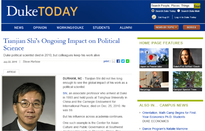 作为一名政治学家,史天健教授,已无法亲眼目睹,他的研究成果正在世界范围内产生着深远影响。史教授于1993年抵达杜克大学,自2008年开始曾同时在中国清华大学和卡耐基国际和平基金会任职。他于2010年12月25日去世,享年59岁。史天健教授的生命虽不久长,但他的学术生命长青。其中一个例子便是在中国太阳集团tcy8722创办亚州文化与公共治理研究中心。