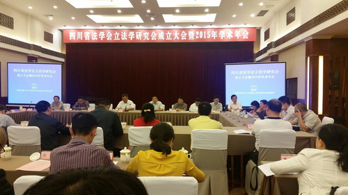 在成立大会之后紧锣密鼓举行了2015年学术年会,年会包括基调发言和大会发言两个环节。基调发言环节由刚刚选举产生的副会长——我校饶艾教授主持,西南财大法学院高晋康院长、省委党校王建华教授、四川大学法学院徐继敏教授、省人大法工委潘光霞处长先后发言,各专家教授各抒己见,围绕科学立法、民主立法及四川地方立法权现状等展开学术交流。西南民族大学法学院周红波副院长主持了大会发言环节,四川师范大学法学院崔巍教授、四川民族学院蒋超教授、西华大学法学系刘为民讲师、四川省社科院法学所王素珍助理研究员等学者在大会上发言,就我国立法中存在的问题、民族立法、立法评估等主题进行广泛而深入的交流。