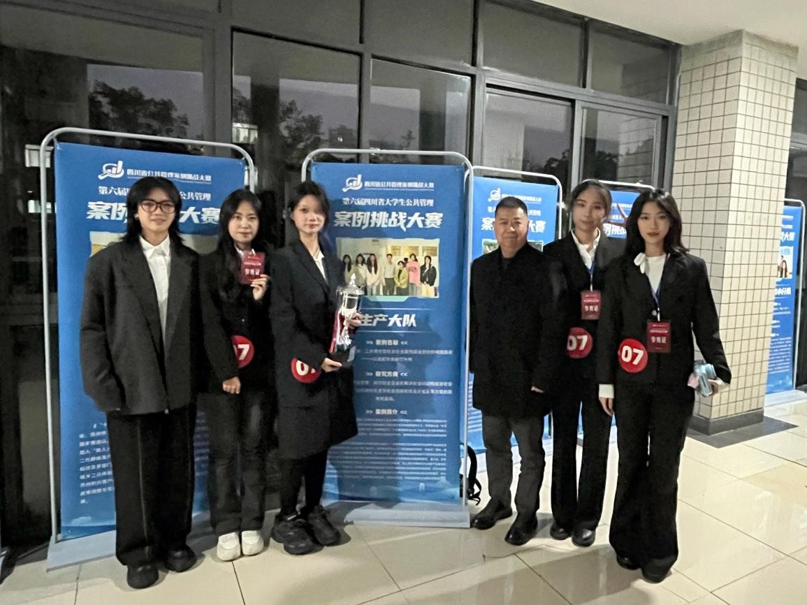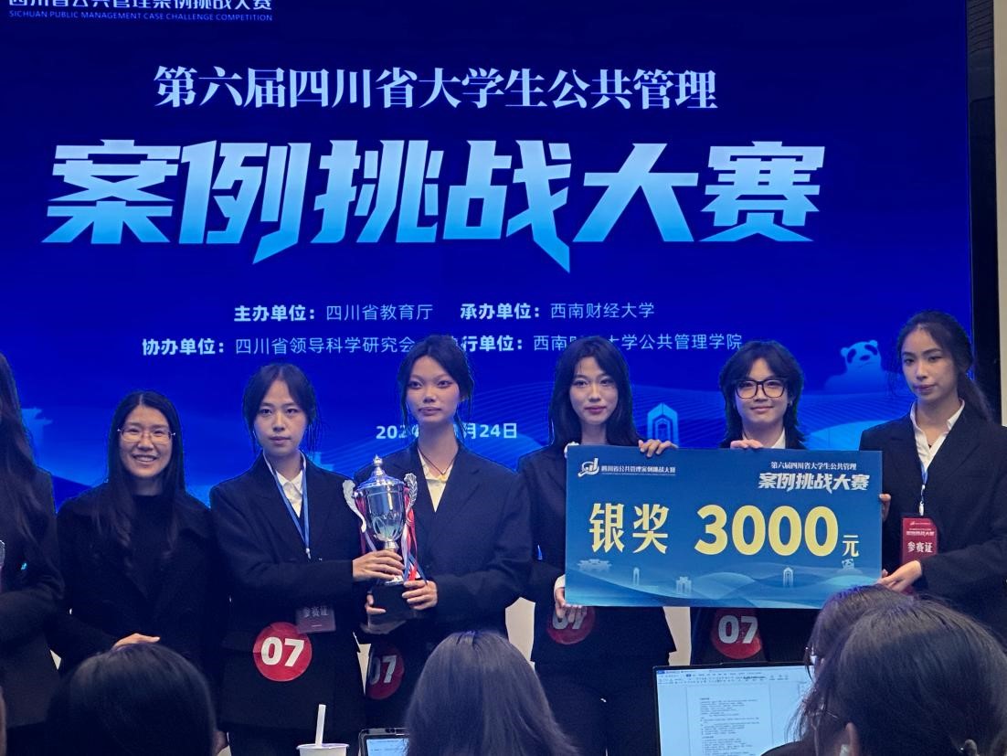 2024年11月24日,由四川省教育厅主办,四川省领导科学研究会协办、西南财经大学承办第六届四川省大学生公共管理案例挑战大赛决赛在西南财经大学圆满落幕。由我院温雪梅老师指导,政治学与行政学专业2022级本科生张成玉、李嘉凌、周卓芸、蔡依彤、刘雨鹭组成的参赛队伍“生产大队”与来自中山大学、四川大学、兰州大学等43所高校共96支队伍历经五个月的激烈角逐,突出重围,最终以总分第二的成绩在决赛中斩获“一等奖银奖”!