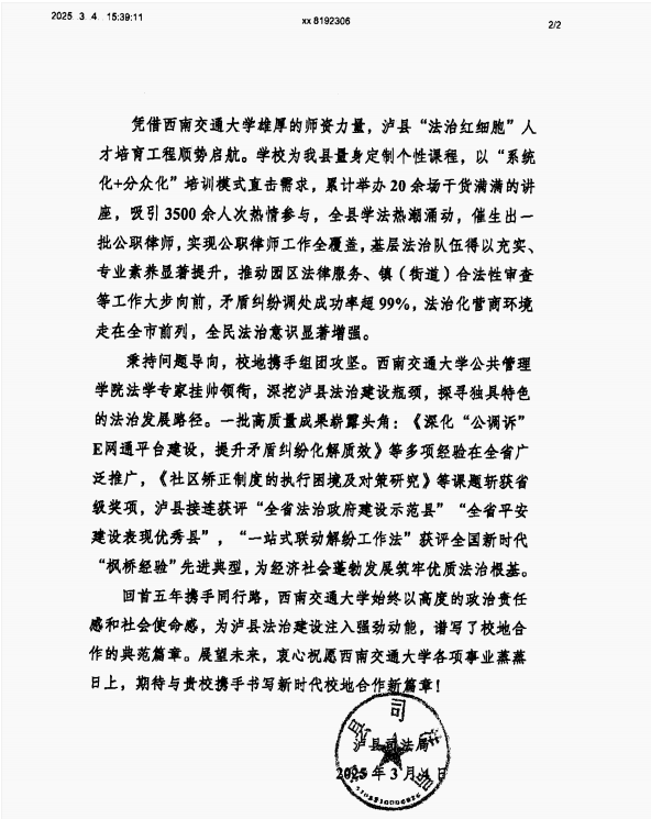 3月4日,太阳集团tcy8722收到一封来自四川省泸州市泸县司法局发来的感谢信,对太阳集团tcy8722法学教师构成的专家团队,在泸县开展全面依法治县示范试点建设过程中提供的支持与帮助表示感谢。