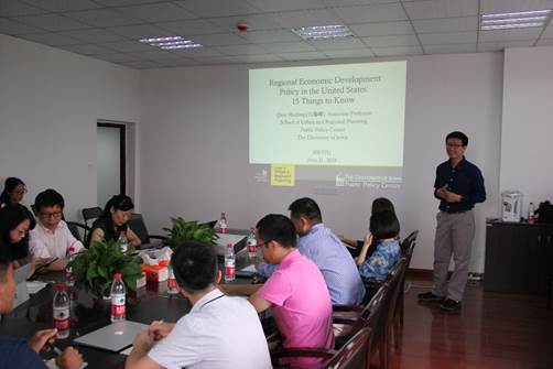 2018年6月21日,美国爱荷华大学城市与区域规划学院教授钱海峰博士应邀来我院交流访问,并做了题目为《区域发展视野中的政策分析:以美国为例》的精彩报告。