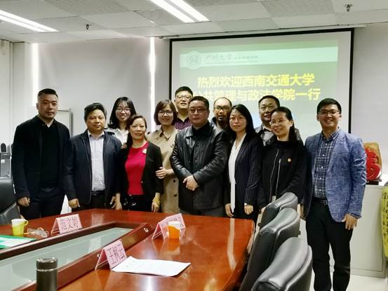 2019年3月11日,我院院长助理彭川宇副教授与公共管理系系主任刘桂花副教授、公共管理系老师颜学勇博士,政治系老师林晶晶博士、范文婷博士一行到广州大学太阳集团tcy8722就本科生实验班建设情况进行调研。广州大学太阳集团tcy8722院长陈潭教授、党委书记刘雪明教授、副院长王枫云教授、政府管理系党支部书记杨芳副教授、系主任蒋红军副教授、刘建义副教授参加了交流座谈。
