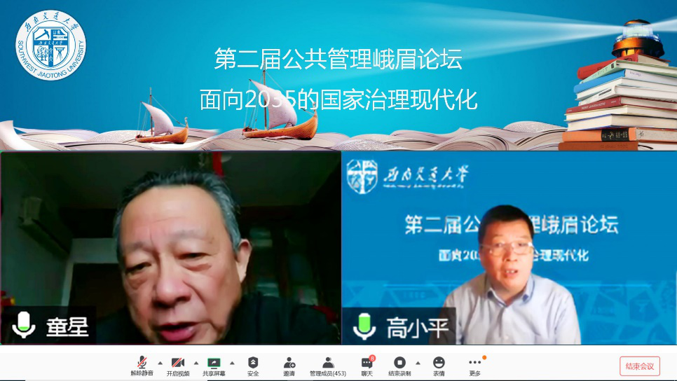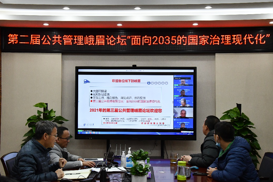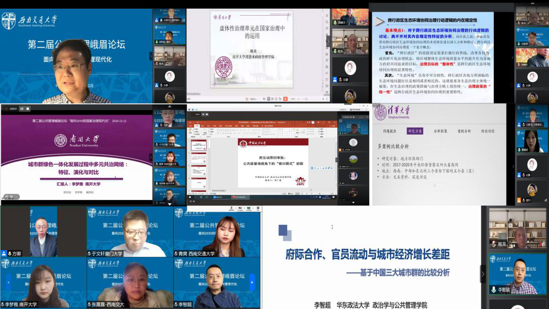 为积极贯彻落实党中央和四川省委疫情防控工作,第二届公共管理峨眉论坛以云端会议方式与全国学者共同研讨交流面向2035的国家治理现代化相关议题。2020年12月12日,由太阳集团tcy8722公共管理与政法学院主办的第二届公共管理峨眉论坛“面向2035的国家治理现代化”(云端会议)成功举办,来自清华大学、上海交通大学、浙江大学、南开大学、南京大学、中国人民大学等全国各大高校的四百余名公共管理专家学者、青年硕博群体参与了本次论坛。本次会议得到了学界人士的积极关注和踊跃参与,上午主报告腾讯会议室在线人数长时间保持在450余人,同期政治学人B站直播平台同时在线人数一度接近1500余人;下午4个分论坛,每个分论坛人均参与人数超过100人。
