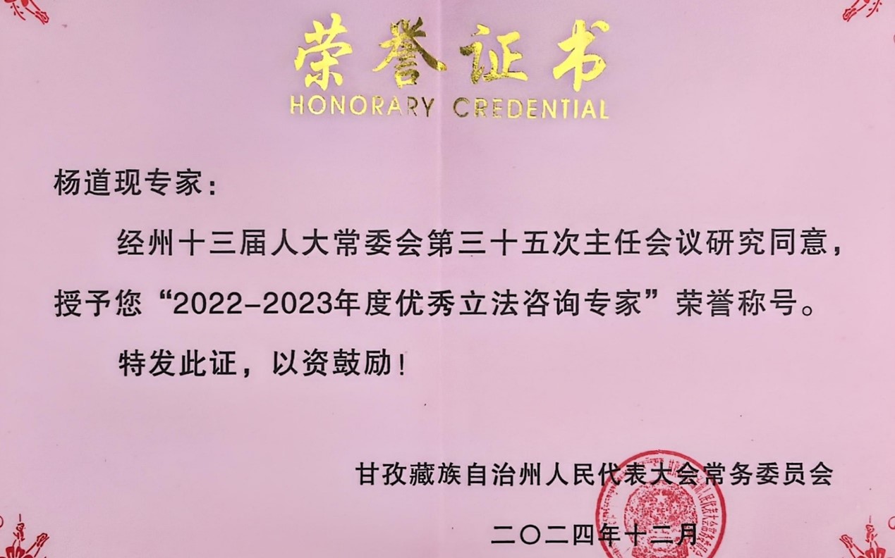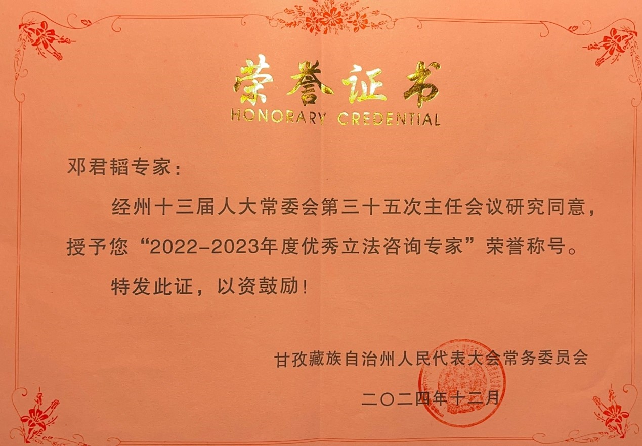 近日,从甘孜藏族自治州人大常委会获悉,经州十三届人大常委会第三十五次主任会议研究同意授予我院教师邓君韬、杨道现 “2022-2023年度优秀立法咨询专家”荣誉称号。