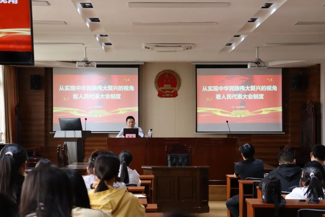 围绕“人民代表大会制度如何运行”这一核心问题,周老师系统讲解了人大的四项基本职权。讲座中,周老师向与会同学讲解人大代表的职权范围,重点阐释了“全过程人民民主”理念在代表履职中的体现,指出人民代表大会制度不仅是制度安排,更是实现人民当家作主的重要渠道。