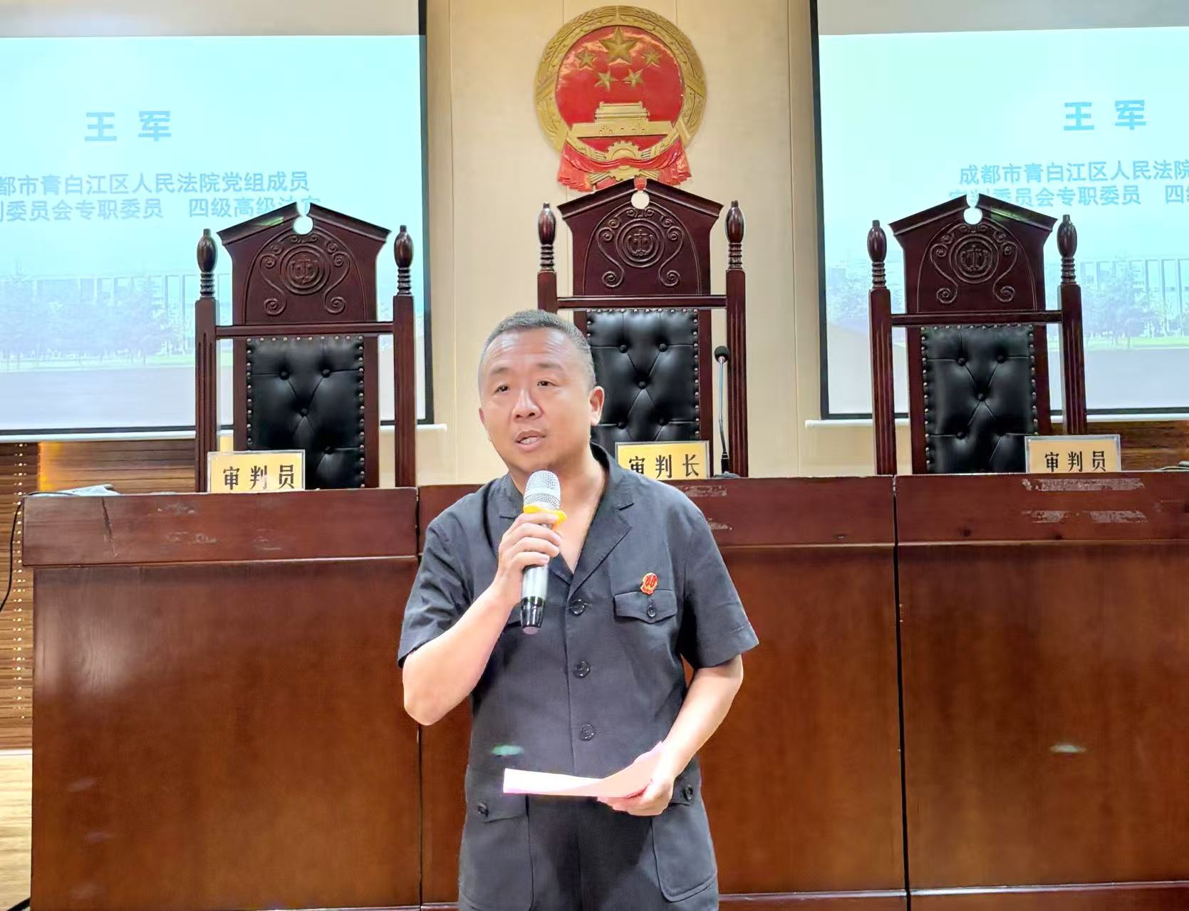王专委在致辞中高度肯定了模拟法庭竞赛的实践价值。他指出,模拟法庭竞赛是法院为学生们“量身打造”的职业启蒙之旅,这种沉浸式训练是对学生专业知识的综合考核,对培养学生的法律逻辑思维,提升辩论技巧具有深远意义。他满怀期待地鼓励选手们在模拟庭审中充分锤炼自身本领、收获宝贵成长经验,进一步锻炼司法技能,提升实务能力,为投身法治建设打下坚实基础。随后,刘鑫教授对青白江区人民法院在模拟法庭案例支持、专业评审等方面给予的长期大力支持表达了诚挚的感谢。同时,他也鼓励参赛选手们珍惜与法官面对面交流的机会,把竞赛当作学习的课堂、成长的阶梯,在实践中感悟法律的温度与力量,真正实现从“书本知识”到“实务能力”的跨越,淬炼“崇法、尚德、精业、致公” 的法治信仰。