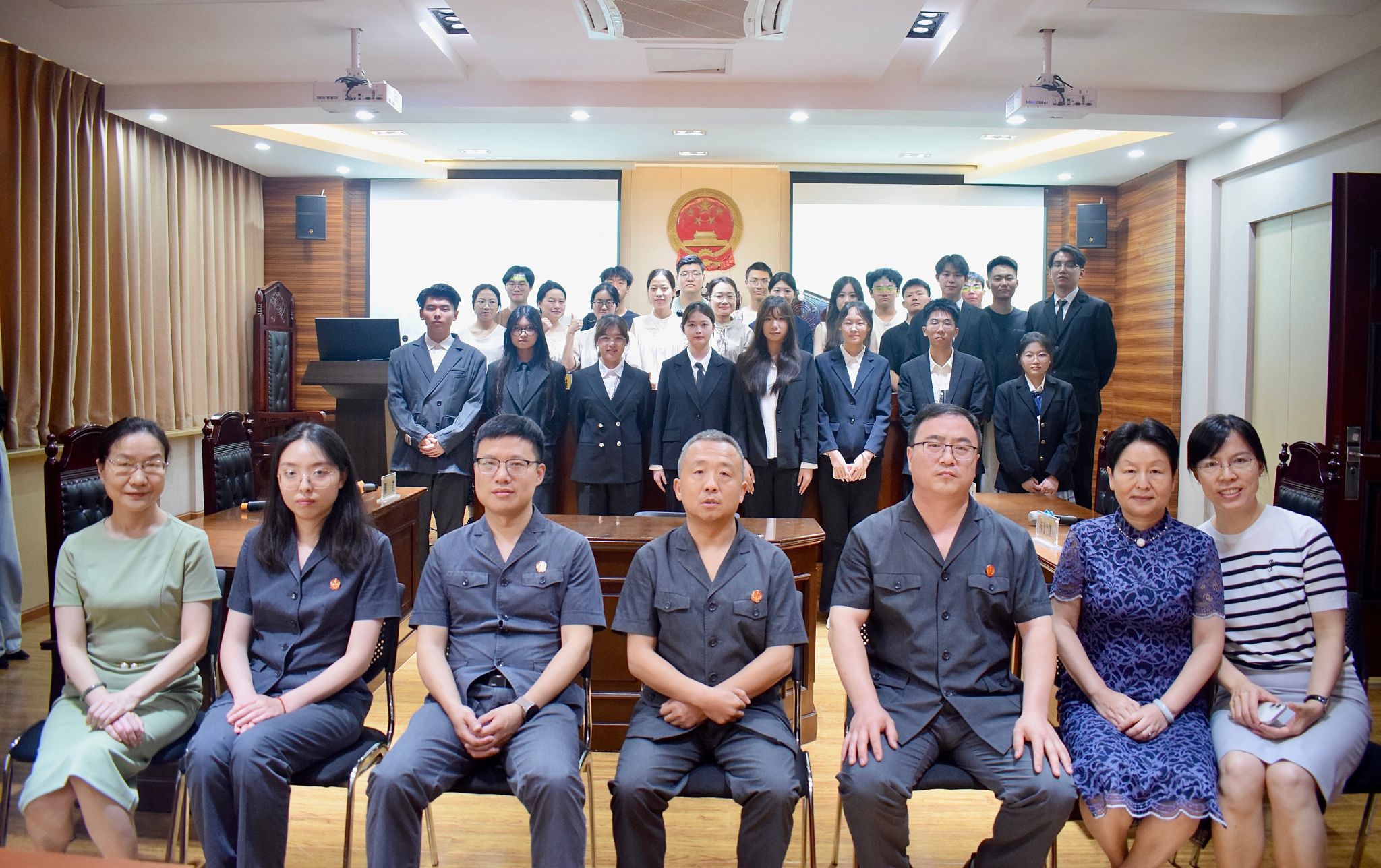 随着评审环节的结束,赛事迎来激动人心的收官时刻。王专委现场揭晓决赛成绩与竞赛最终获奖名单:唐佳坤团队凭借卓越表现摘得桂冠,张轩铭团队荣获亚军,两支队伍共同斩获一等奖;徐雅欣、蒲文静团队获得二等奖;刘雨晨、张书韵、段千羽、谭亦婷四支团队荣获三等奖;李宇轩、宋渤林团队获得优胜奖。随后,王军专委、江铮庭长、马磊副庭长和邓琳惠法官依次为获奖队伍颁发荣誉证书,并与全体参赛选手合影留念,共同记录下这一荣耀时刻。