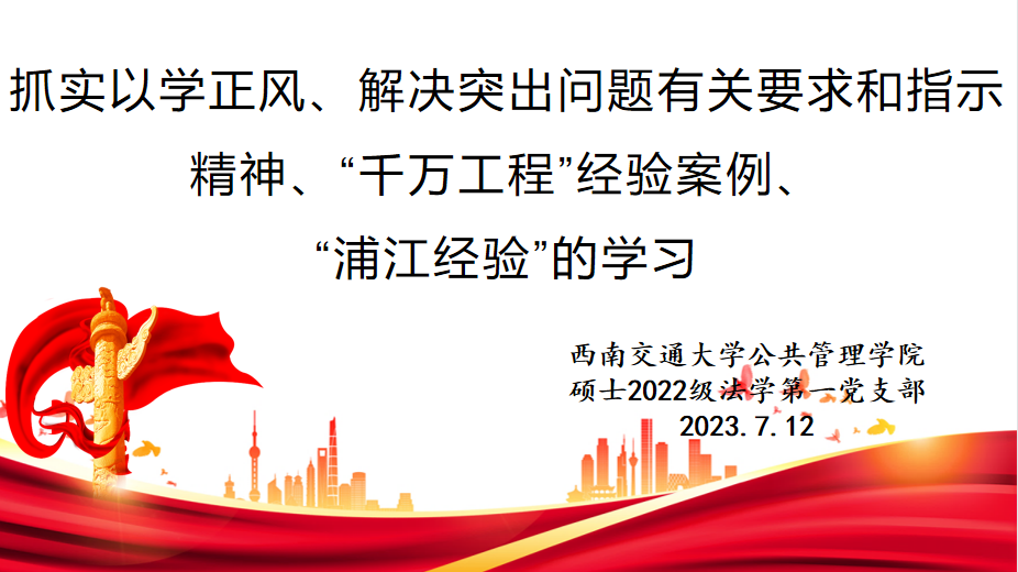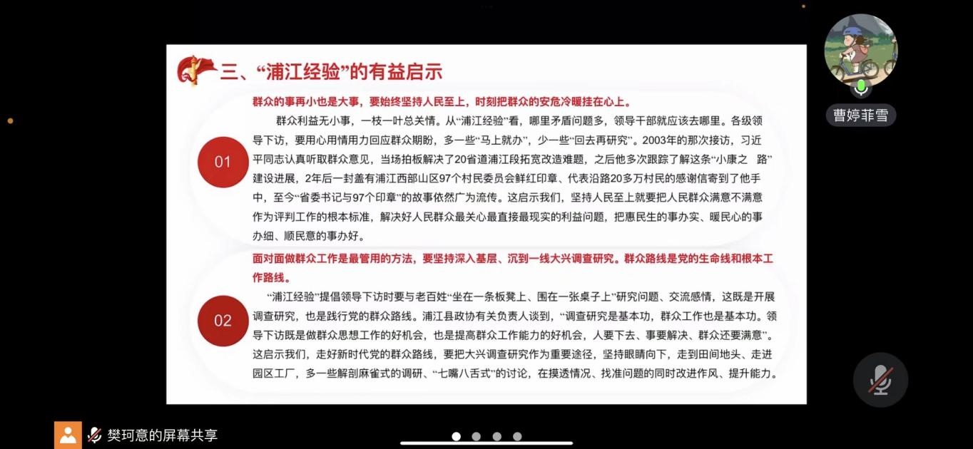 2023年7月12日20:00,太阳集团tcy8722硕士2022级法学第一党支部于线上腾讯会议开展“习近平总书记在内蒙古调研时对抓实以学正风、解决突出问题有关要求和指示精神、‘千万工程’经验案例,学习运用好‘浦江经验’”主题教育政治理论学习。本次学习由第二党小组同志主讲,全体党员和入党积极分子参加。