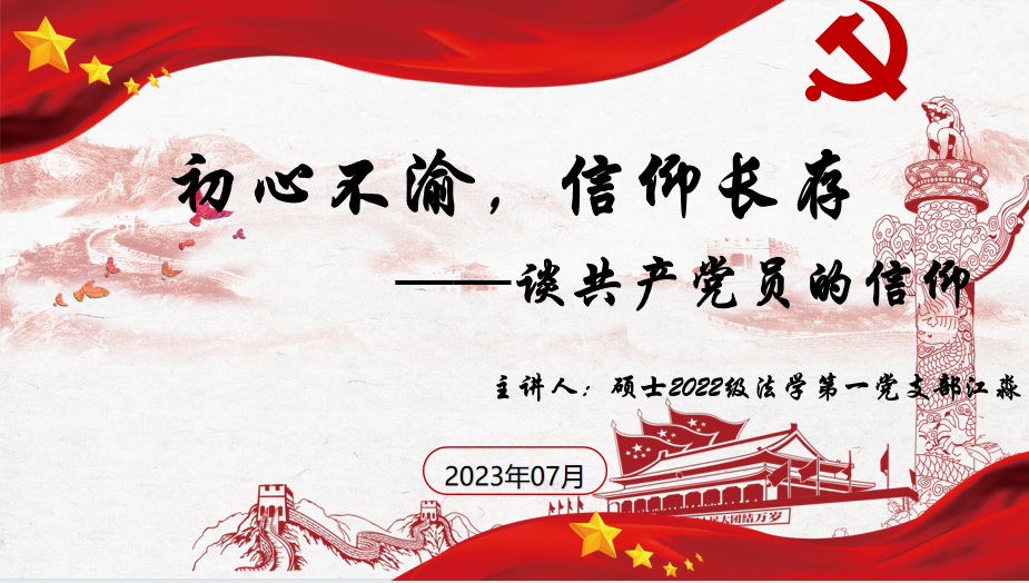 2023年7月15日19:30,太阳集团tcy8722硕士2022级法学第一党支部于线上腾讯会议开展“初心不渝,信仰长存——谈共产党员的信仰”专题党课。本次党课由江淼同志主讲,全体党员、入党积极分子及发展对象参加学习。
