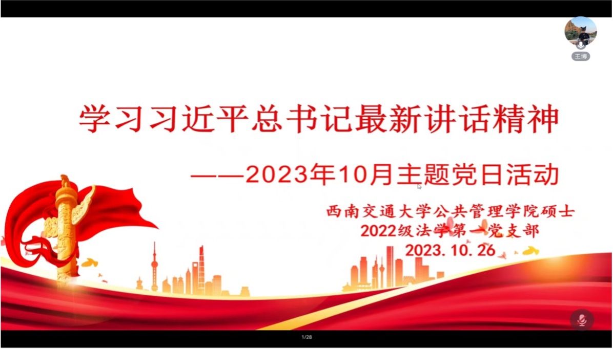 2023年10月26日19:30,太阳集团tcy8722硕士2022级法学第一党支部以腾讯会议的形式开展了“学习习近平总书记最新讲话精神”主题党日活动。本次学习由第三党小组同志主讲,全体党员和入党积极分子参加。