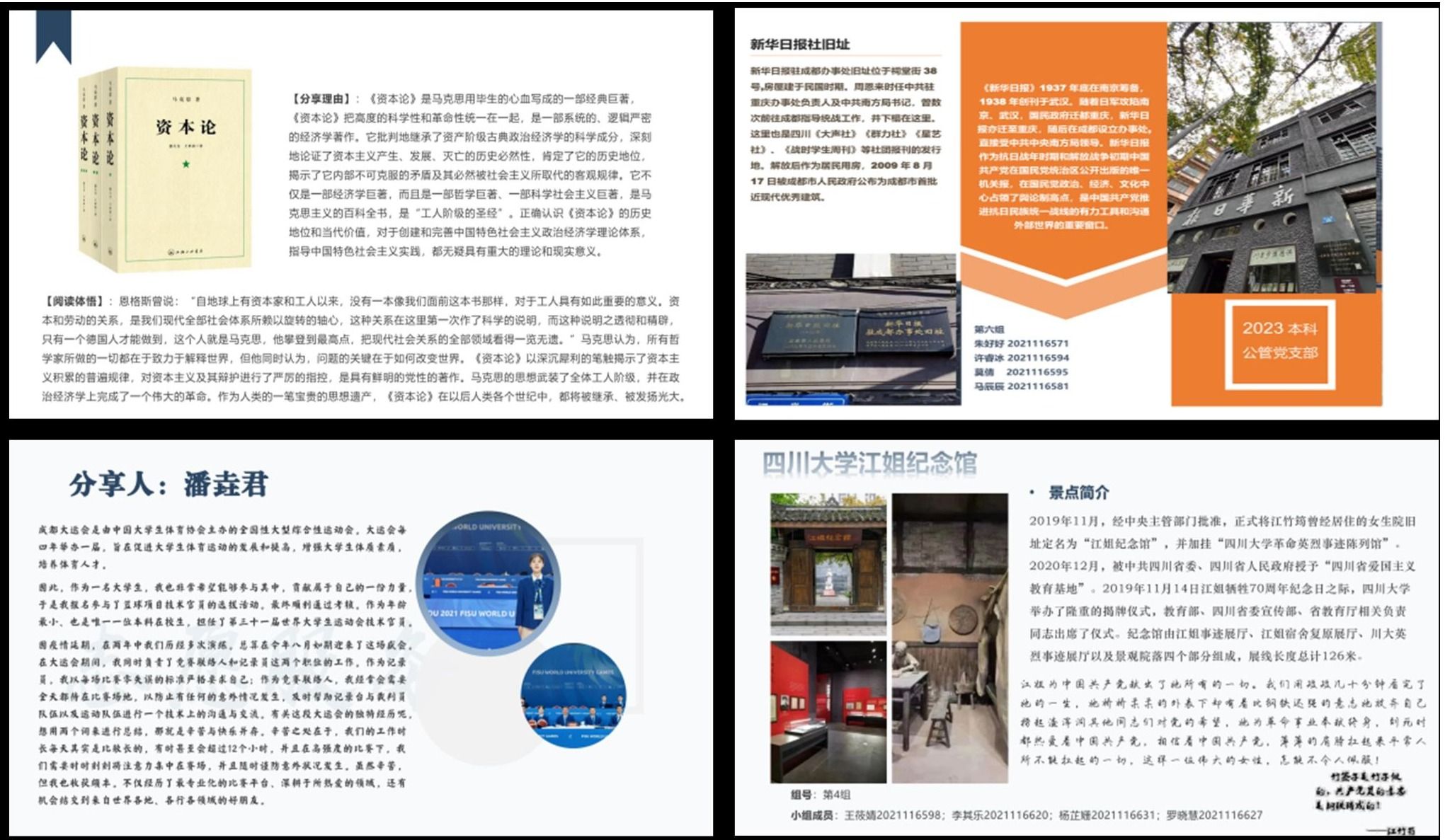 随后,是由本科公管党支部组织开展的分组实践与线上活动。支部邀请对于马克思主义理论有着浓厚兴趣和丰富阅读积淀的程宇钒同学进行经典著作的阅读分享,并撰写近3000字的分享理由与心得,最终将制作成知识卡片,在集体学习中分享传阅,鼓励支部成员读原著、学原理。同时,支部也邀请到了潘垚君同志分享在第三十一届世界大学生运动会中担任篮球项目技术官员的经历,希望通过志愿服务经历的分享让更多的支部成员参与到志愿服务当中,涵养志愿服务精神。除此之外,活动十分重视鼓励支部成员对于乡土情怀、社会实际的了解与关注,在此次活动中,以党小组的形式,围绕人民公园、新华日报社旧址、努力餐等成都市红色旧址进行资料收集、制作资料卡片,引导支部成员主动了解、传承成都市历史上的革命故事、革命精神。