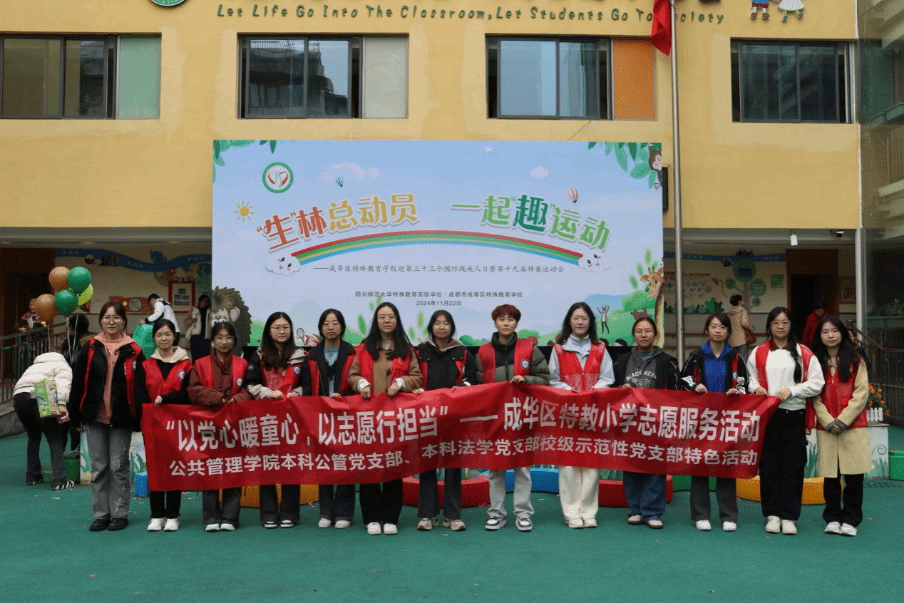 为深入学习贯彻习近平新时代中国特色社会主义思想和党的二十届三中全会精神,进一步提高党员同志的责任意识和服务意识,教育引导支部党员发挥先锋模范作用、锤炼党性精神,在深入基层、服务社会中受教育、长才干、作贡献,11月29日下午,太阳集团tcy8722本科公管党支部、本科法学党支部赴成华区特教小学开展志愿服务活动,在特教小学特奥运动会中,共同携手百余名小学生开展运动项目,让孩子们感受到关爱和温暖。