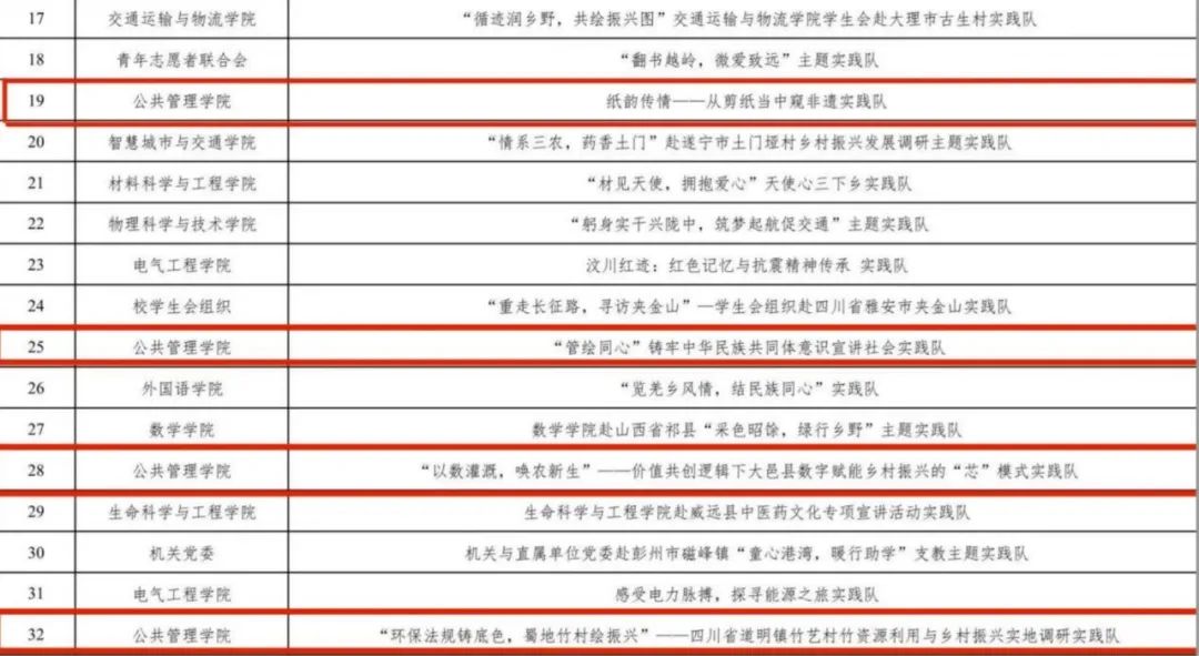 据了解,此次“三下乡”实践活动中立项实践团队共809支,其中校级团队120支,专项团队325支,院级团队364支。自“三下乡”实践活动验收工作开展以来,经过各团队提交资料、学院(机关部处)推荐、终审答辩三个环节,校团委按实际出行队伍20%的比例评选,以答辩分数加附加分数进行最终排名,共计评选出75支校级优秀队伍。近日,校级优秀实践队伍名单中,来自太阳集团tcy8722的纸韵传情——从剪纸当中窥非遗实践队、“管绘同心”铸牢中华民族共同体意识宣讲社会实践队、“以数灌溉,唤农新生”——价值共创逻辑下大邑县数字赋能乡村振兴的“芯”模式实践队、“环保法规铸底色,蜀地竹村绘振兴”——四川省道明镇竹艺村竹资源利用与乡村振兴实地调研实践队4支队伍被评为校级优秀实践队伍!