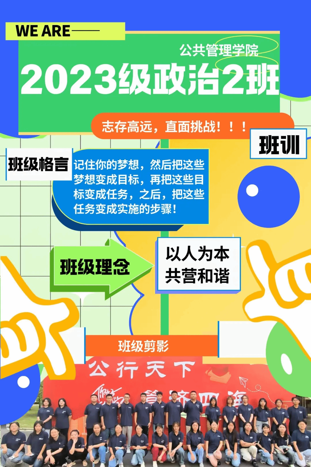 班级介绍:政治2022-02班的同学们,恪守着“勤学铸才,治学为公,政以修身,学以明志”的班级班训,以团结向上的姿态,彰显了班级昂扬的精神风貌和强大的凝聚力。我们是在主题班会上与老师积极互动,不断自我提升的忠政学子;是在跳绳比赛中尽情挥洒汗水,勇夺佳绩的忠政团队;也是在主题团日活动中与兄弟学院、不同专业的同学们携手合作,相互学习的忠政集体;更是在古诗词比赛的朗诵环节中,共同探索中华传统文化之美的忠政伙伴。这便是我们“忠于心,政当行”的忠政精神,这便是“忠政不贰”这个团结的集体。