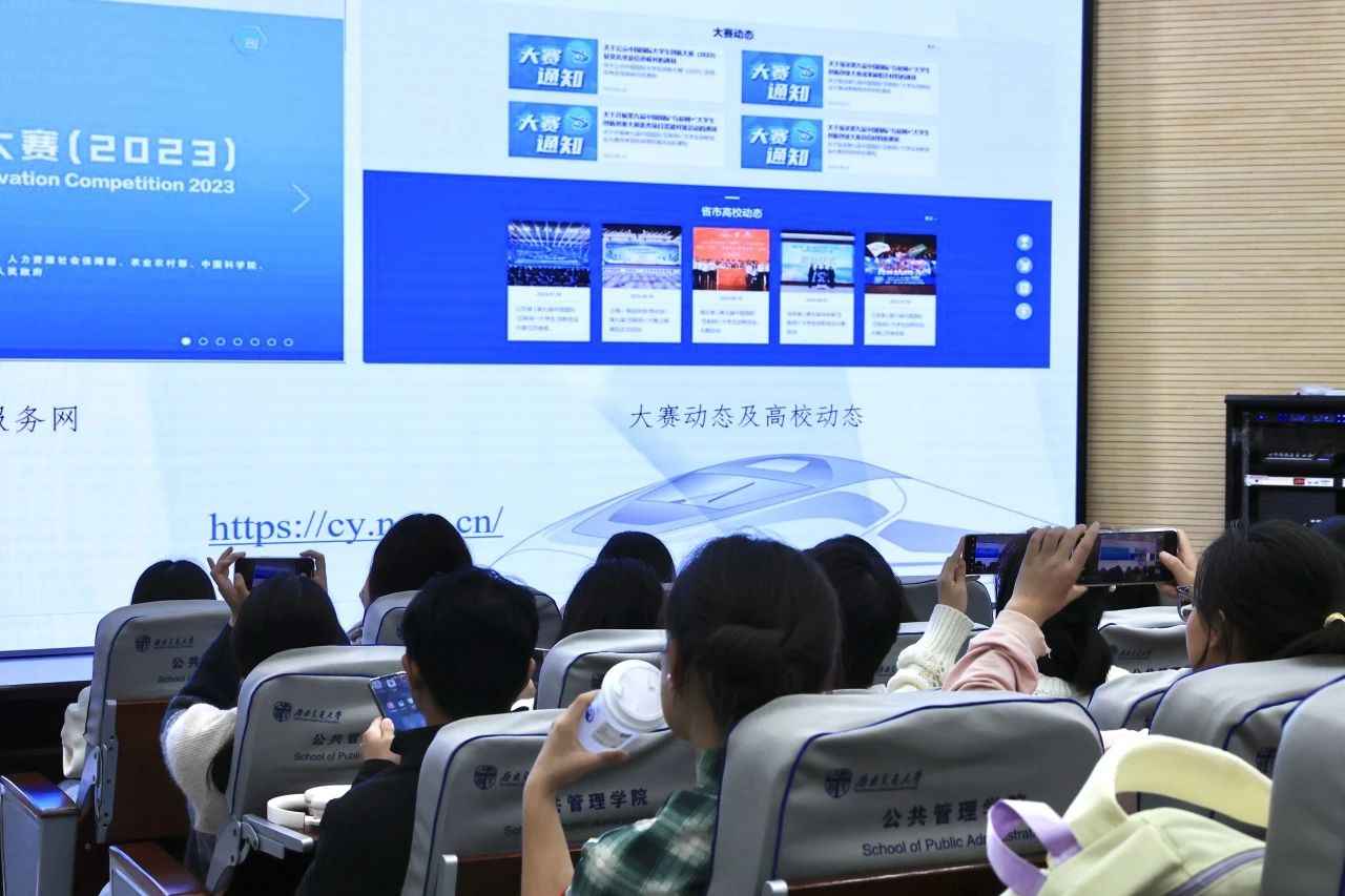 与“挑战杯”系列赛事地位相当的“互联网+”赛事被列为第二个重点,王老师首先直截了当地指出其易操作、赛程紧的特点,再围绕青年红色筑梦之旅赛道展开讲解,并以自己的参赛经历为例,将自身经验倾囊相授,给出了组队报名、挖掘项目和项目选择方向的小技巧。其间,王大海老师对于几项具有可操作性和可持续性的项目的分析,使在座学子更为切实地体会到科创竞赛项目的高标准。