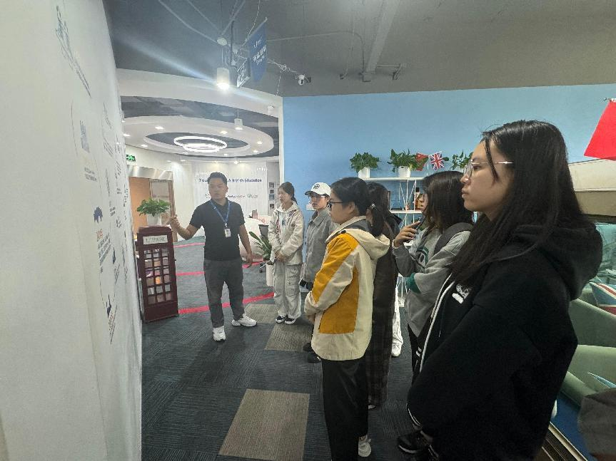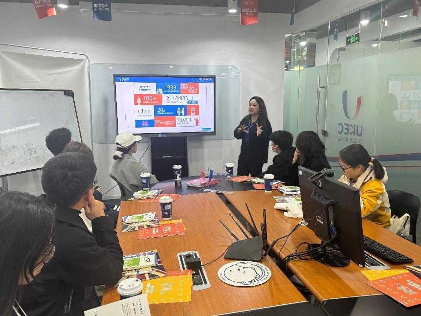 在英国教育中心(UKEC)中国运营中心徐老师和周老师的热情接待下,师生一同参观了企业各办公区域,亲身体验了英国教育中心(UKEC)老师们的工作环境,感受到其积极、融洽的工作氛围。周老师从企业背景、办公环境、企业文化等多个维度,为大家详尽地介绍了UKEC的基本情况、服务优势以及所获得的荣誉,让大家对UKEC有了更全面的认识。