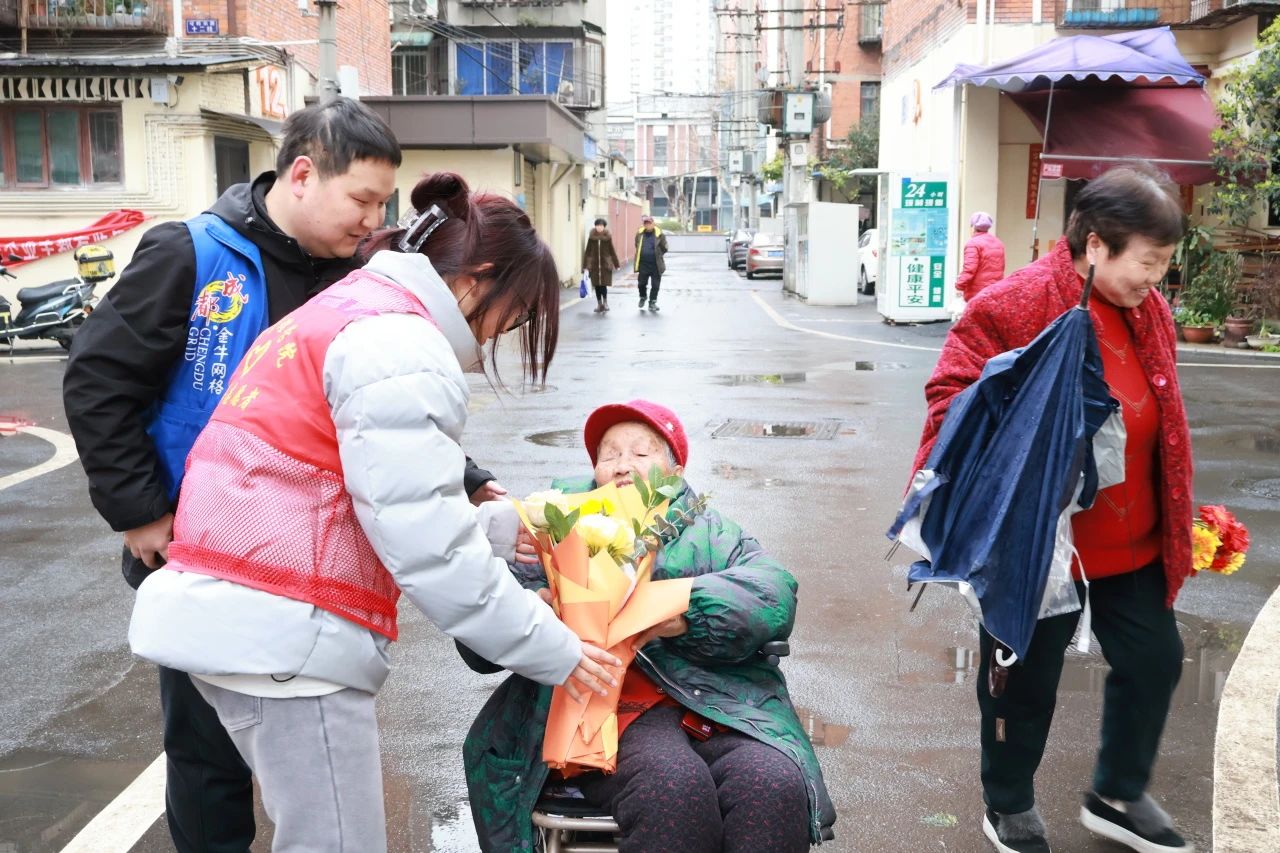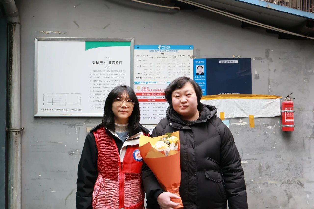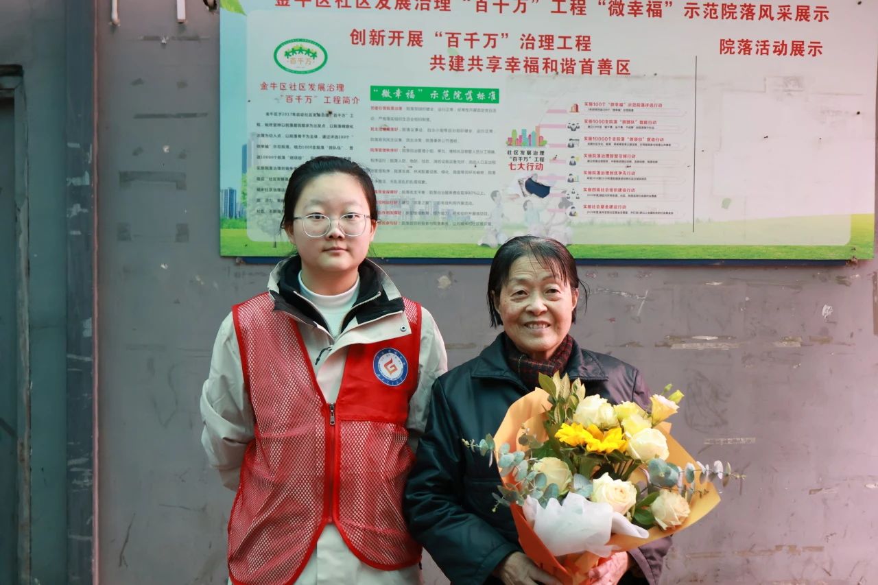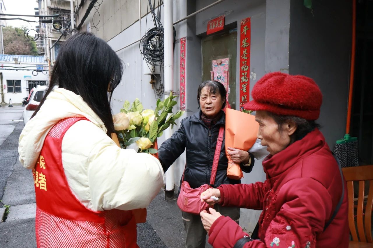 花束制作完成后,志愿者们分为3个小组,在社区工作人员的带领下,依次探访社区妇女居民。志愿者们献上精心制作的向日葵花束,向她们送上热情真挚的节日祝福。志愿者们嘘寒问暖,关切地询问她们的生活近况,并对社区老年妇女们表达了亲切的问候,倾听她们的人生故事,致敬她们辛勤付出的岁月,并祝愿她们生活如愿、身体康健、生命如向日葵般绚烂绽放。女性居民们对志愿者们的到来也十分感动,纷纷表达诚挚的谢意,并鼓励他们努力学习、砥砺前行,为社会贡献更多力量。