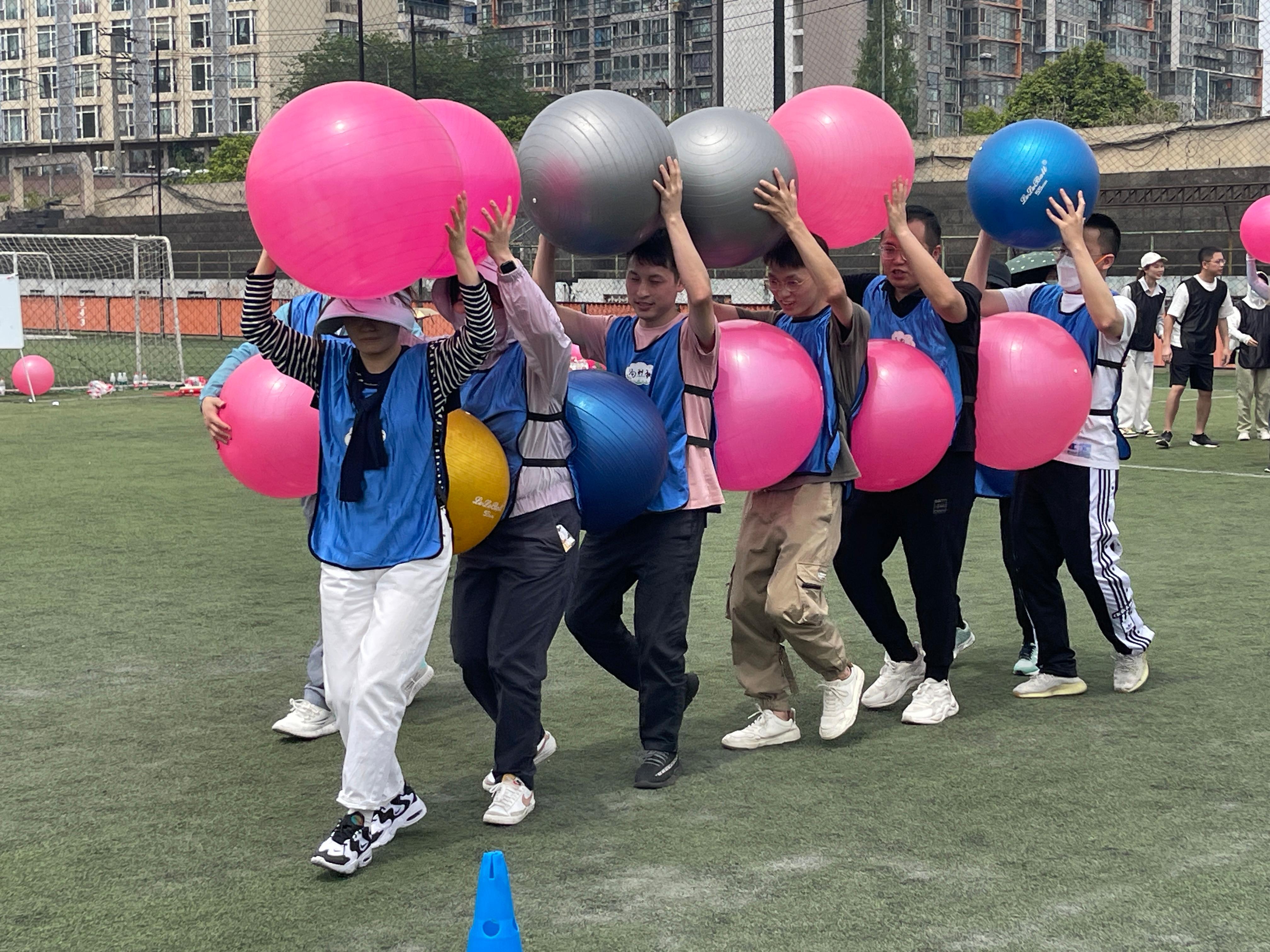 手举皮球,蜈蚣竞走。选手们相互用身体前后夹着大皮球,同时双手举起另一个大皮球,在球不落地的情况下,列成纵队,向前奔跑。双脚一起一落间,共同迈进,不仅考验着选手的协调力,更考验着他们相互配合的默契度。
